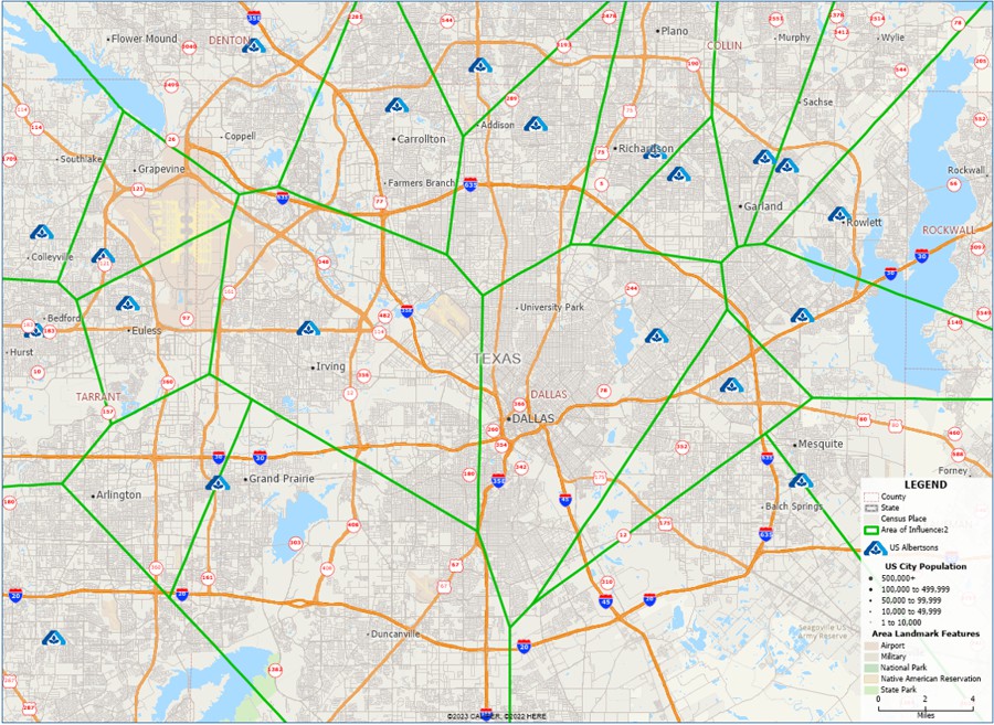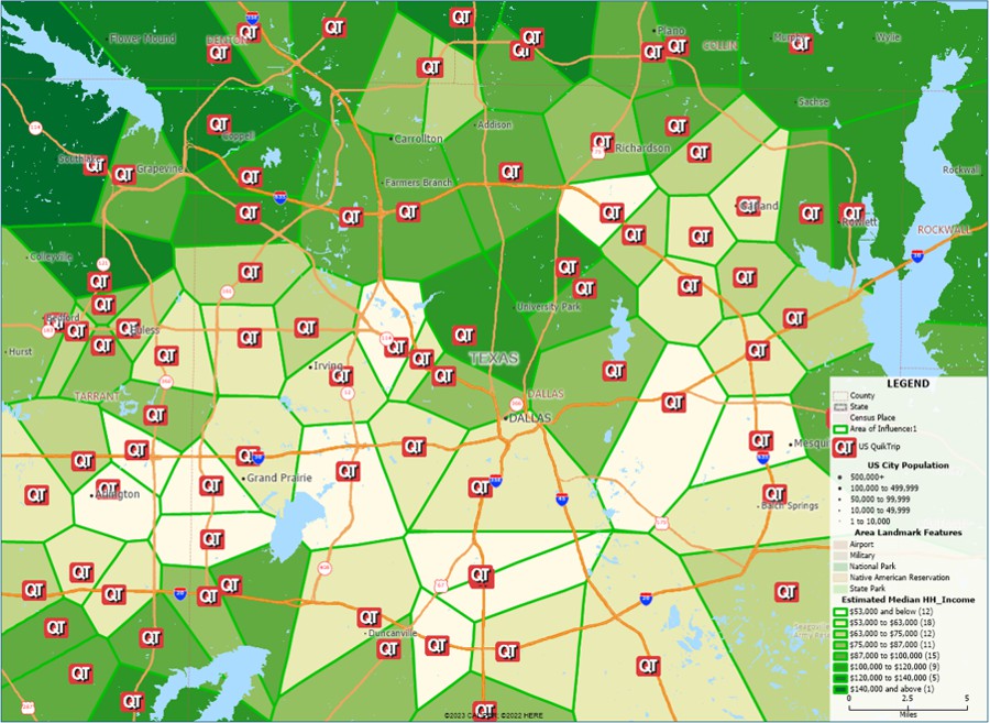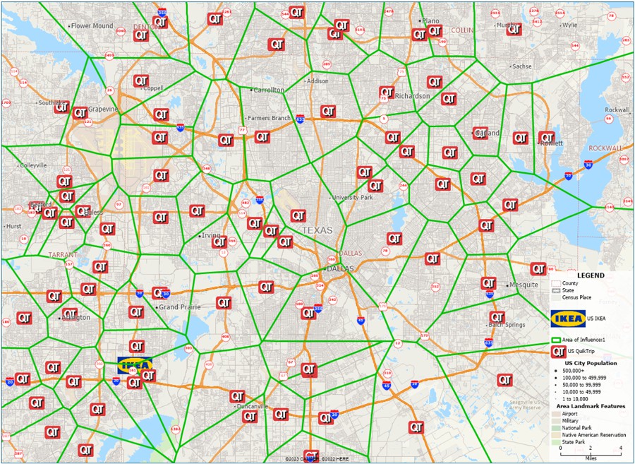 Map 1 provides an example of a straight-line area of influence analysis for QuikTrip ("QT"), a gas and convenience store chain retailer with an extensive network in Dallas-Fort Worth. This map depicts the local market area served by each of the 83 QT locations in Dallas.