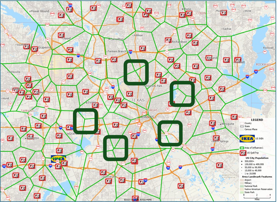 Second, the identification of local service areas emphasizes the locations on the map that are furthest from current facilities in the network. To see this, we need to recognize that each service area boundary (drawn in green) represents the midway point between two QT stores. Therefore locations that represent the junction of three or more service areas are particularly far away from the closest QT (see Map 4). Of course, more analysis is required to verify suitable location opportunities, but the area of influence map provides an early and simple indication of a possible need for a new store.