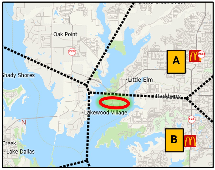 Map 5 illustrates this problem with the example of McDonald’s restaurant locations in Denton, Texas. Note how the straight-line areas of influence assign the neighborhood marked by the red oval (Lakewood Villag) to be served by location B. However, given the extent and coverage of the lake there, there is actually no road that directly connects the Lakewood Village neighborhood to location B. Instead, the McDonald’s at location A is clearly best positioned to serve Lakewood Village.