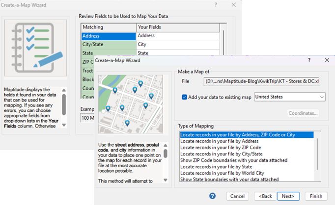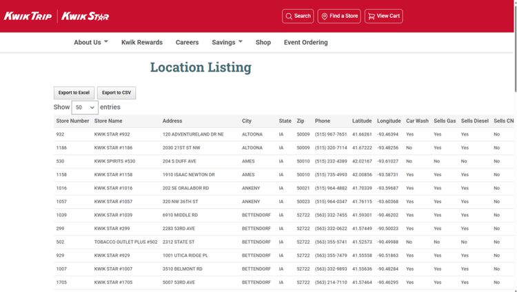Store location data for this analysis comes directly from the Kwik Trip/Kwik Star website. Alternatively, you can import business location data from the Maptitude built-in layers or create a spreadsheet manually using addresses from Google Maps or similar sources.
