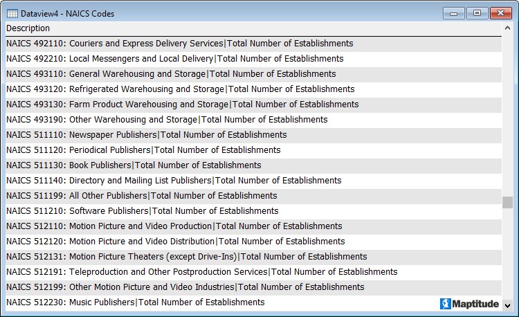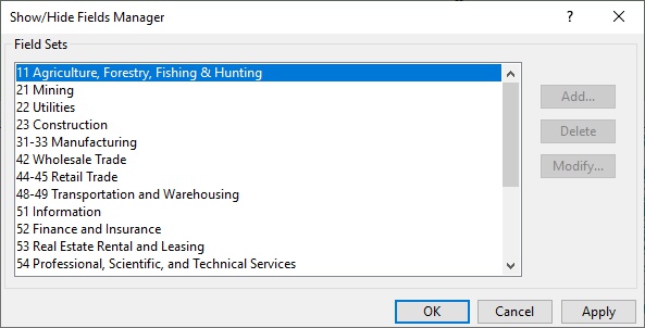 Often, the only data relevant to your organization may be those within a specific two-digit NAICS sector. You can choose to limit dataviews to show just the data in a specific sector using the predefined Field Sets that are provided in Maptitude.