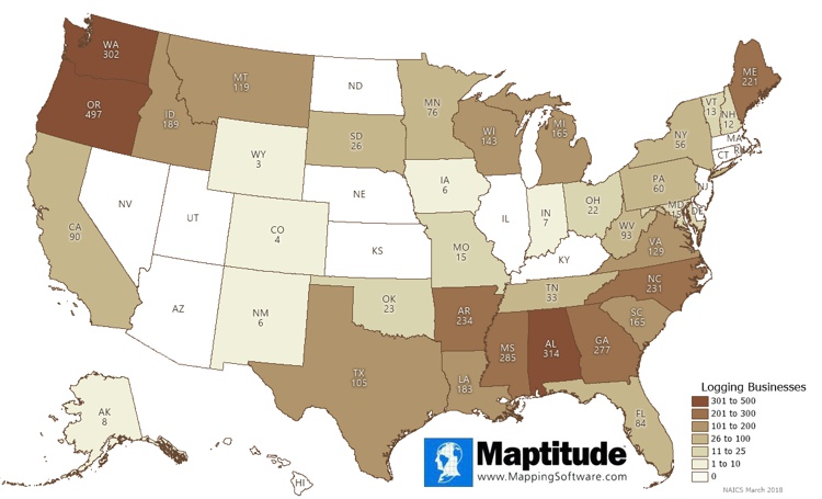 The number of logging businesses is just one of the business count fields available for Maptitude. Maptitude users can download a free ZIP Code layer that has business counts for 978 NAICS codes including logging, timber tract operations, mining, and more.