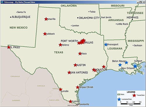 Two Maptitude data layers of point locations: Texas (red stars) and Louisiana (blue stars)