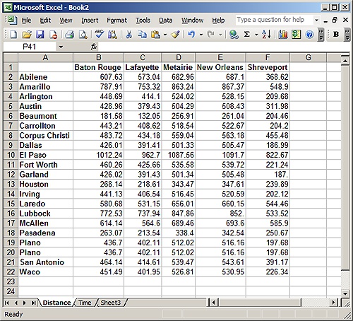 Results showing all driving distances from each Texas city to each Louisiana city.