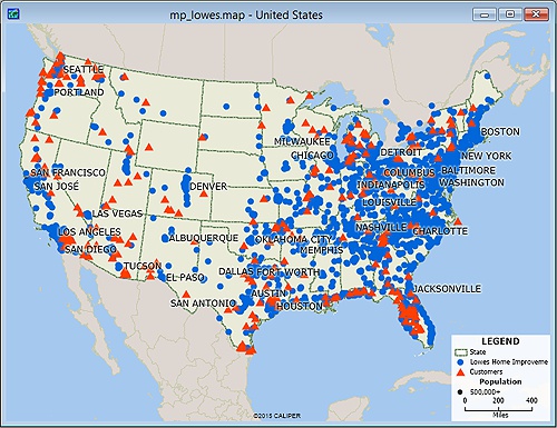 Here is an example using data taken from Larry Petersen's POI Mega File (this has been imported into Maptitude 2015 using the new MapPoint import option). We are using Lowe's Home Improvement stores for our store locations (blue circles). The customers are marked with red triangles, and are actually derived from RV camp locations: