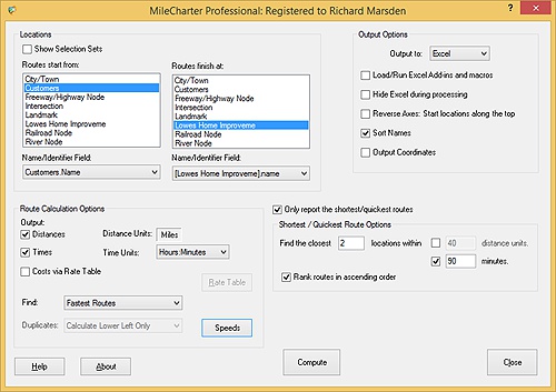 Often we are only interested in the closest locations. For example, we might be trying to match customers with their closest store locations. We could use two data layers as above, but this results in a large table of numbers and further work is required to extract the closest destinations. It is very inefficient in both computer time and user time. Luckily the Professional license of MileCharter* has an option to only report the closest destinations. As well as limiting the results to only the closest destinations, MileCharter* is clever enough to only calculate the routes which have a chance of being included in the final results. This results in huge improvements in processing time.