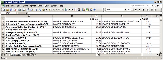 We actually calculated the distances and the travel times. These are reported on separate worksheets (tabs), and the above worksheet shows the distances. The first column (A) displays each customer. The closest store is in column B with the distance (in miles) in C. The second closest store (if any) is in column D with the distance in column E.