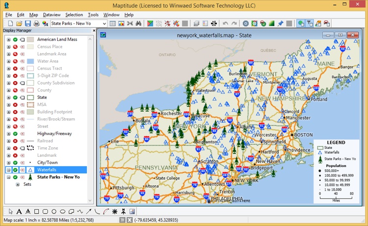 Here are the New York State Park and Waterfall pushpin sets imported as layers into Maptitude: