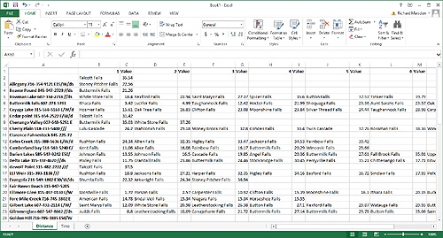 Our MileCharter* add-in product for Maptitude can easily find the distances between pushpin sets. It can also perform what is essentially a query to find the closest pushpins. These abilities can be combined with the Mega POI template to help plan a journey or road trip. In this example, we are planning a tour of New York state parks, but would really like to see waterfalls. Perhaps we like to photograph them, or we love the atmosphere around a good waterfall. Anyway, the task is to find the state parks in New York that are close to waterfalls.