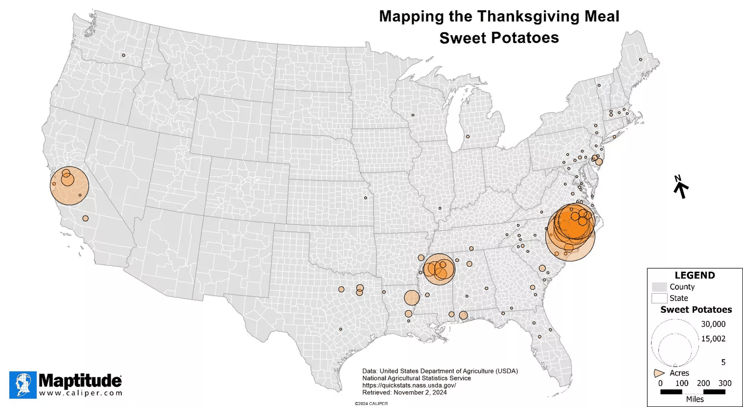 Sweet potatoes became a part of the Thanksgiving meal in the early 20th Century, when Thanksgiving became a national holiday. Sweet potatoes grow best in warm to hot climates, and minimal cold weather or frost threat. The top states for sweet potato production include North Carolina, California, Mississippi, and Louisiana. The map below shows where there are at least 5-acres of land devoted to sweet potato production.