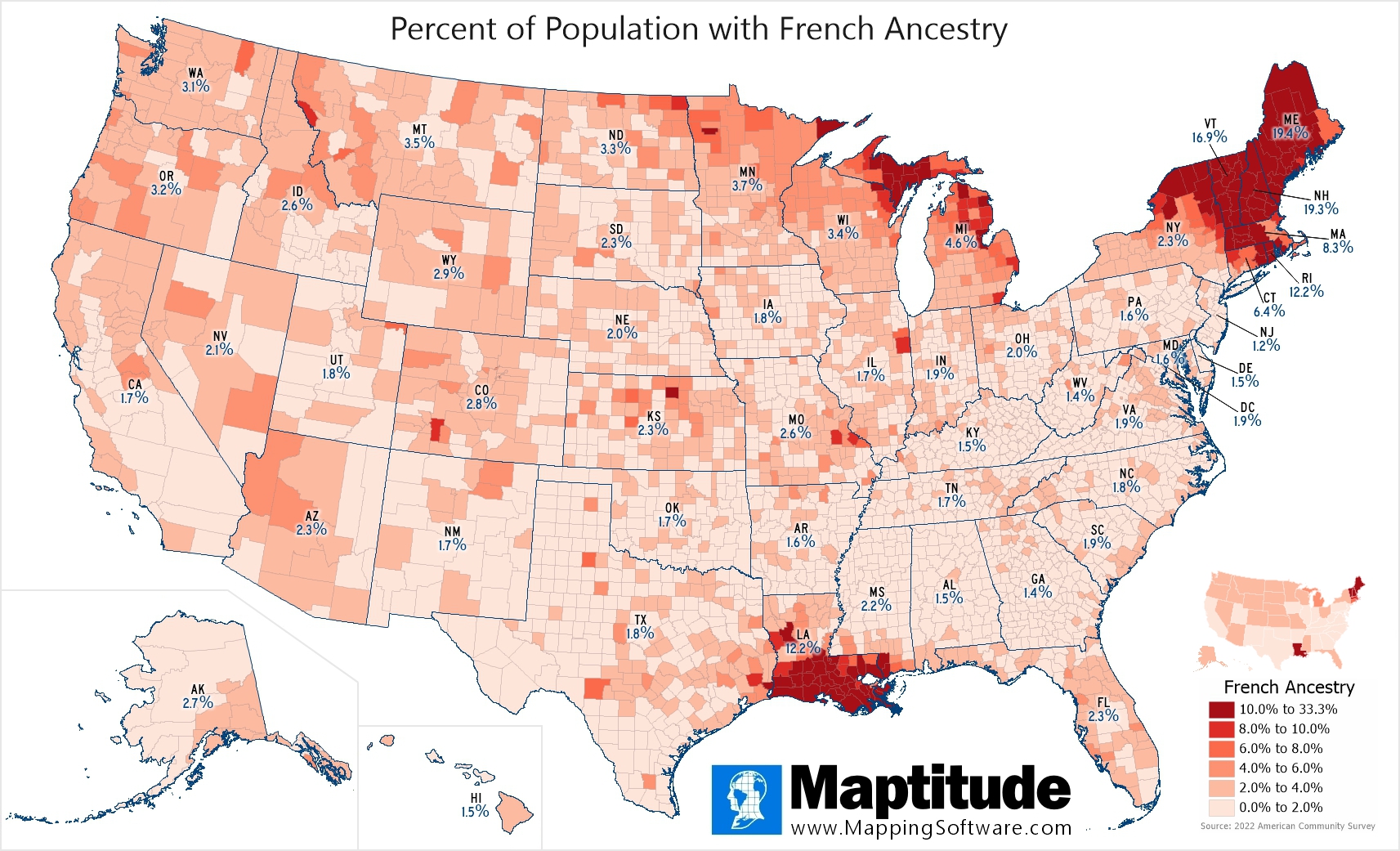 Maptitude is the best mapping software for business intelligence! Maptitude includes detailed demographic data so you can make accurate and informed decisions. For Bastille Day (July 14) we mapped the percent of the population with French ancestry by county. There are 8.6 million Americans (2.6%) with French Ancestry, primarily in Northern New England, Northern Michigan, and Louisiana. The counties with the greatest portion of French ancestry are Androscoggin ME (33.2%), Coos NH (31.7%), Aroostook ME (30.0%) and Saint Martin LA (29.0%). Overall, the states with the highest French population are Maine (19.4%), New Hampshire (19.3%), and Vermont (16.9%).