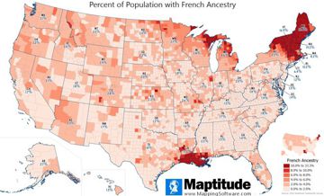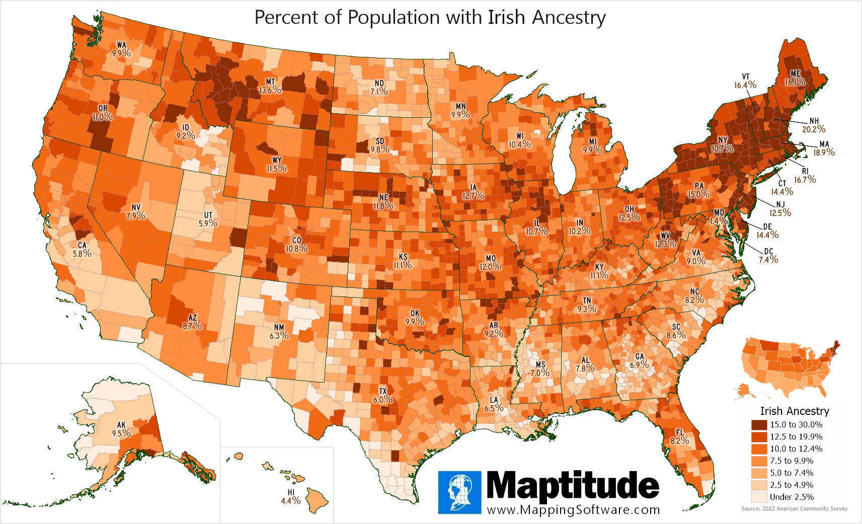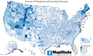 Maptitude is the best mapping software for business intelligence! Maptitude includes detailed demographic data so you can make accurate and informed decisions. For St. Patrick's Day we mapped the percent of the population with Irish ancestry by county. There are 31.3 million Americans (9.4%) with Irish Ancestry according to the American Community Survey. Four counties are at least one quarter Irish: Cape May NJ (28.6%), Plymouth MA (28.4%), Barnstable MA (25.6%) and Silver Bow MT (25.4%). Overall, the states with the highest Irish population are New Hampshire (20.2%), Massachusetts (18.9%), and Rhode Island (16.7%).
