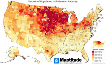 Maptitude is the best mapping software for business intelligence! Maptitude includes detailed demographic data so you can make accurate and informed decisions. For St. Patrick's Day we mapped the percent of the population with Irish ancestry by county. There are 31.3 million Americans (9.4%) with Irish Ancestry according to the American Community Survey. Four counties are at least one quarter Irish: Cape May NJ (28.6%), Plymouth MA (28.4%), Barnstable MA (25.6%) and Silver Bow MT (25.4%). Overall, the states with the highest Irish population are New Hampshire (20.2%), Massachusetts (18.9%), and Rhode Island (16.7%).