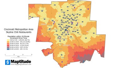 Maptitude is the best mapping software for business intelligence! Maptitude Country Packages include a landmark layer with the locations of businesses and Maptitude includes many geographic analysis tools including ones to create drive-time and distance rings and estimate their demographics.