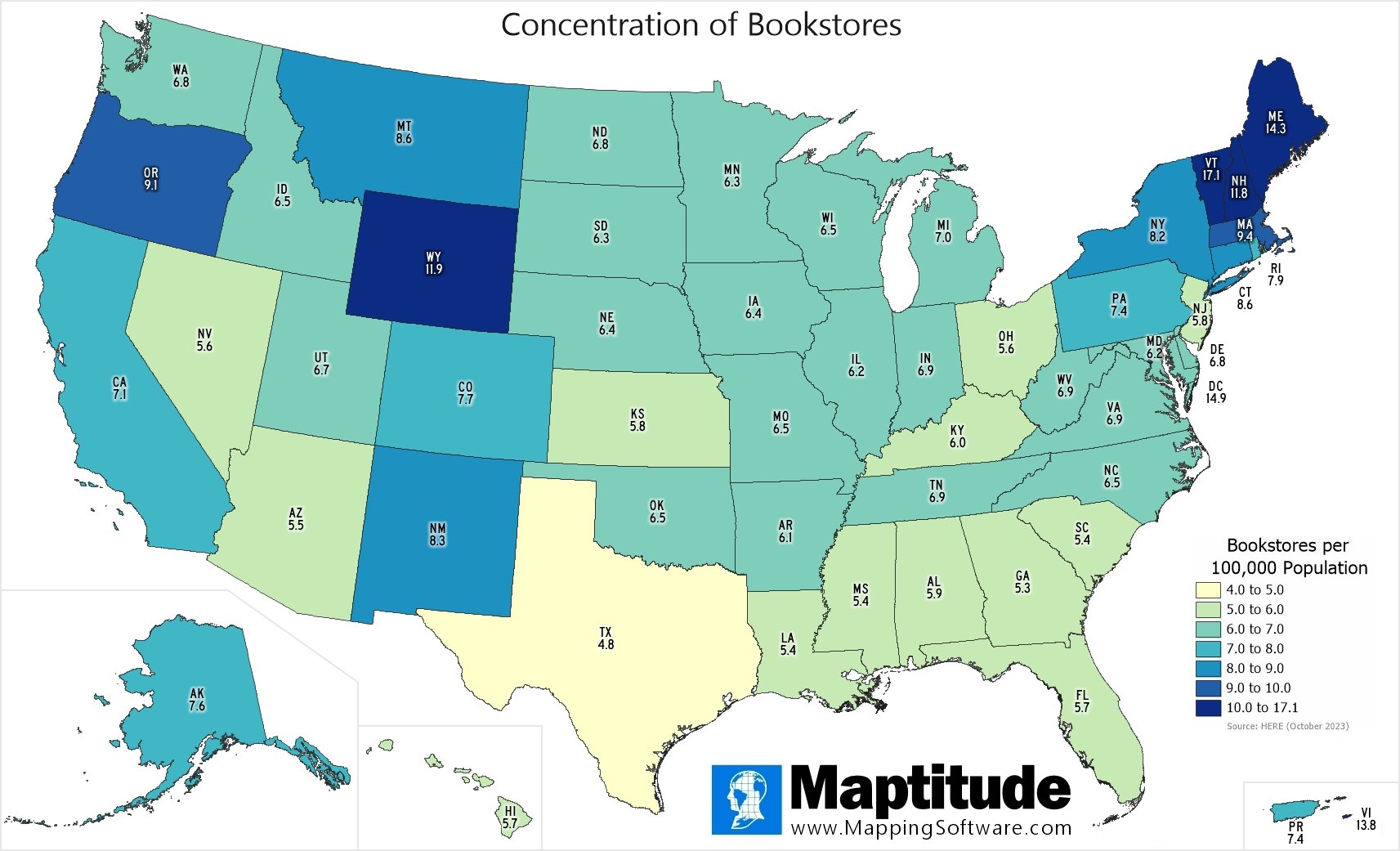 For National Authors Day (November 1) we mapped over 22,000 bookstores nationwide and computed the number of stores per 100,000 people in each state. The national average is 6.6 bookstores per 100,000. The highest concentration of bookstores are in Vermont (17.1), Maine (14.3), Wyoming (11.9), and New Hampshire (11.8).
