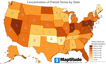 Maptitude is the best mapping software for business intelligence! The Consumer Expenditure data included with Maptitude contains annual household expenditure estimates for nearly 400 different products at the Census Tract level. For National Bacon Day (December 30) we aggregated the expenditure data to compare the household spending on bacon among the states with the results shown below. The states with the highest spending on bacon are Hawaii ($63.58), Washington DC ($63.58), and Maryland ($62.49).