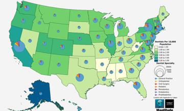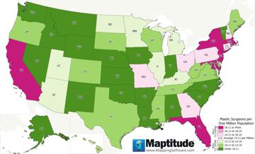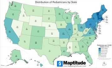 Maptitude is the best mapping software for business intelligence! Free health related map layers enable Maptitude users to better map and understand the U.S. health care network. The Healthcare Providers layer is a point file with the location of 6.7 million healthcare providers and includes taxonomy code(s) for each provider. For this map we selected all of the providers whose primary taxonomy code is 208000000X, "Physicians, Pediatrics" and aggregated them by county and then computed their distribution based on the population age 0-17 in each county.