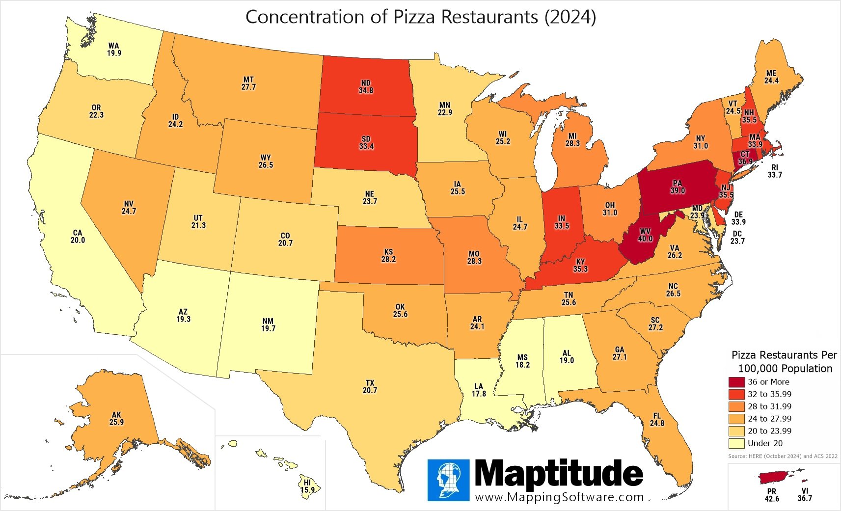For National Pizza Day (February 9) we examined over 87,000 pizza restaurants in the United States and computed the number of pizzerias per 100,000 population in each state. The national average is 26.1 pizza restaurants per 100,000. The highest concentrations can be found in Puerto Rico (42.6), West Virginia (40.0) and Pennsylvania (39.0). We also determined what is the most common pizza chain in each state.