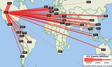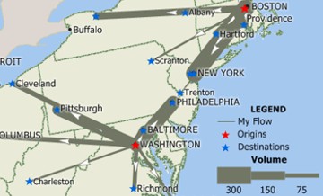 Given a matrix of flows between origins and destinations, desire lines can be used to illustrate those flows on a map.