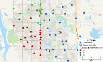 Geospatial clustering is the process of organizing a set of geographical features into groupings named "clusters". Features inside a cluster are highly similar, whereas the clusters are as diverse as possible. Clustering's purpose is to generalize and expose a relationship between spatial and non-spatial attributes. Clustering tools automatically group points or areas into compact clusters, while placing optional constraints on the clusters such as maximum size or a balanced total field, such as sales or population.