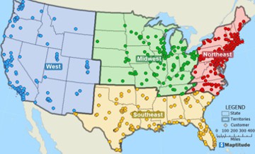 What is geocoding? This map shows customer addresses geocoded onto a map as point locations. All of the original source data, such as sales volume, are also available for mapping and labeling the geocoded point features.