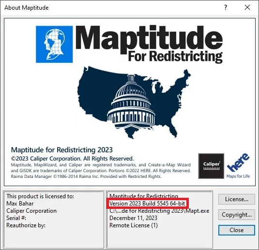 As we improve the Maptitude for Redistricting software, new “builds” of the software are released with incremental improvements. You can see which build of the software you are using by going to Help>About… from the main toolbar.