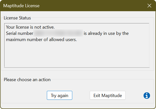 This can happen if you input the serial number incorrectly, or if you are using an old serial number. If you upgrade to the latest version of Maptitude, your serial number will change so make sure you are using the one provided to you in the download email.