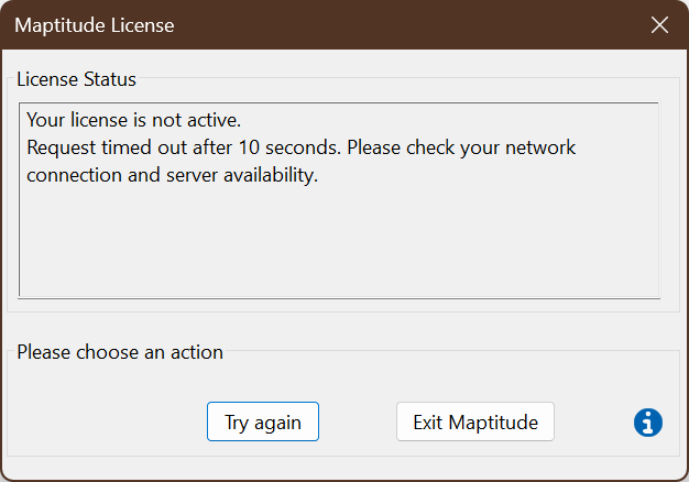 This indicates that there is something interfering with your communication with our network. In the case that this communication is blocked, often by a company firewall, or if you are not connected to the internet, you can perform this communication manually by email. See here for Activating Your Maptitude License Manually