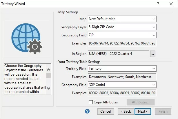 For example, if your territories are based on 5-Digit ZIP Code, make sure that the Geography Field drop down is set to the column name that has the ZIP Code information.