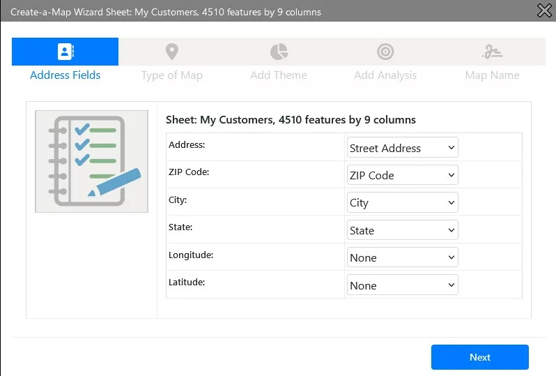 How Do I Create a Map From Excel Data. Address Fields Page. - Select the type of map you would like to create.