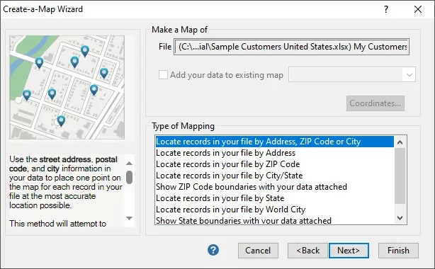 How Do I Create a Map From Excel Data. Type of Mapping Page. - Optionally, you can choose to link your data, which means any changes made to the Excel file will update the map in Maptitude.
