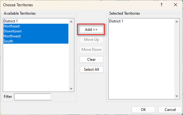 in the Territory Manager to export your territory data to Excel. - Highlight the territories you want to export and click Add.