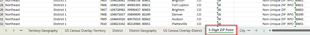 - The resulting Excel file will include a tab/sheet called 5 Digit ZIP Point that includes a column called Name. This should give you a good idea of the towns and cities in your territory. This will also include a column called Territories: Territory that includes the name of your territories.