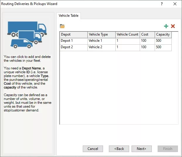 • Add and assign vehicles, specifying costs, capacities, and schedules.