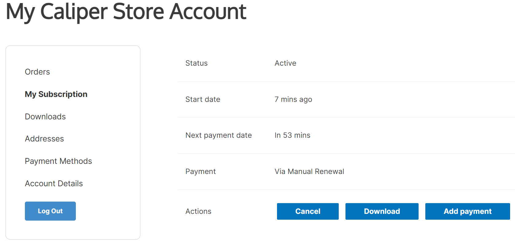 When you first made your subscription, you created a customer store account in the Caliper store. Click the  button along the top bar to access your account.