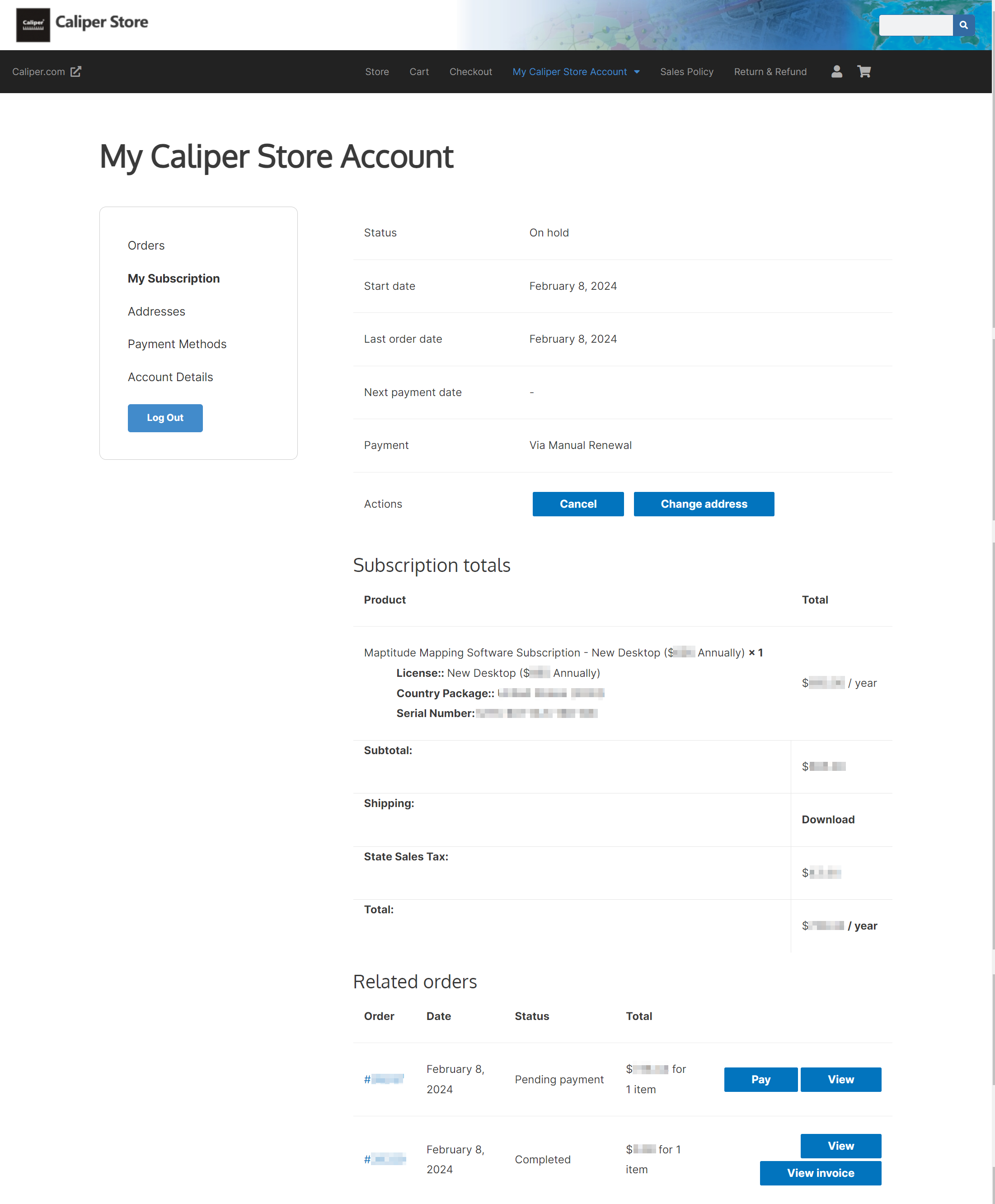 Cancellation and management of your Product subscription is available within the Caliper Store or via email to sales@caliper.com. To cancel a subscription, use “My Account” within the Caliper Store to turn auto-renew off in your account, here: https://www2.caliper.com/store/my-account/subscriptions/. Your current subscription will be active until the expiration date. You can turn on auto-renew before the end date to continue your subscription.