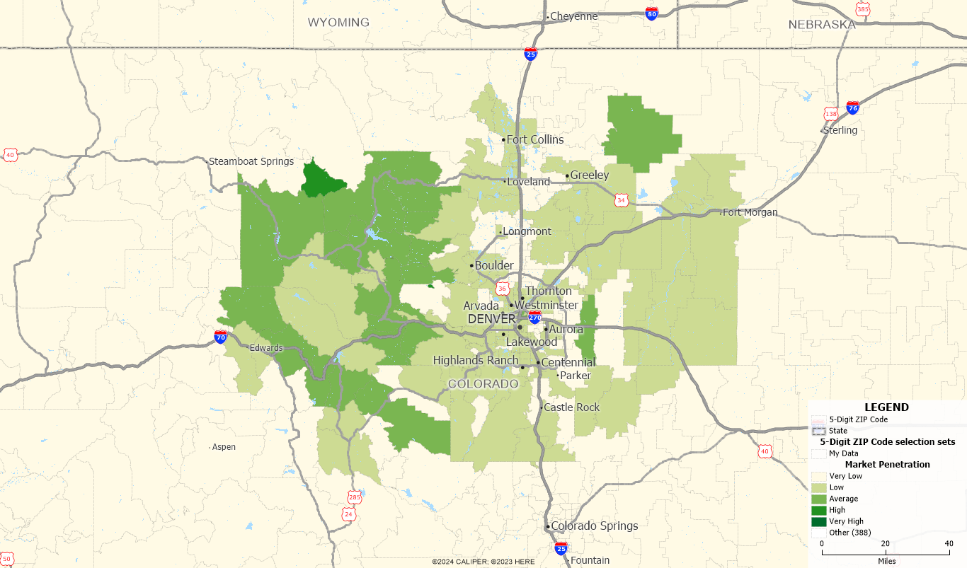 - Create subsets of your ZIP codes based on their market penetration by going to Selection > Select by Theme