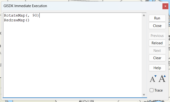 By running a short GISDK command in the Immediate Execution window, you can set the map rotation to any angle between 0 and 359 degrees. This can be useful for presentations, aligning the map with a particular feature, or creating map exports with a custom orientation.