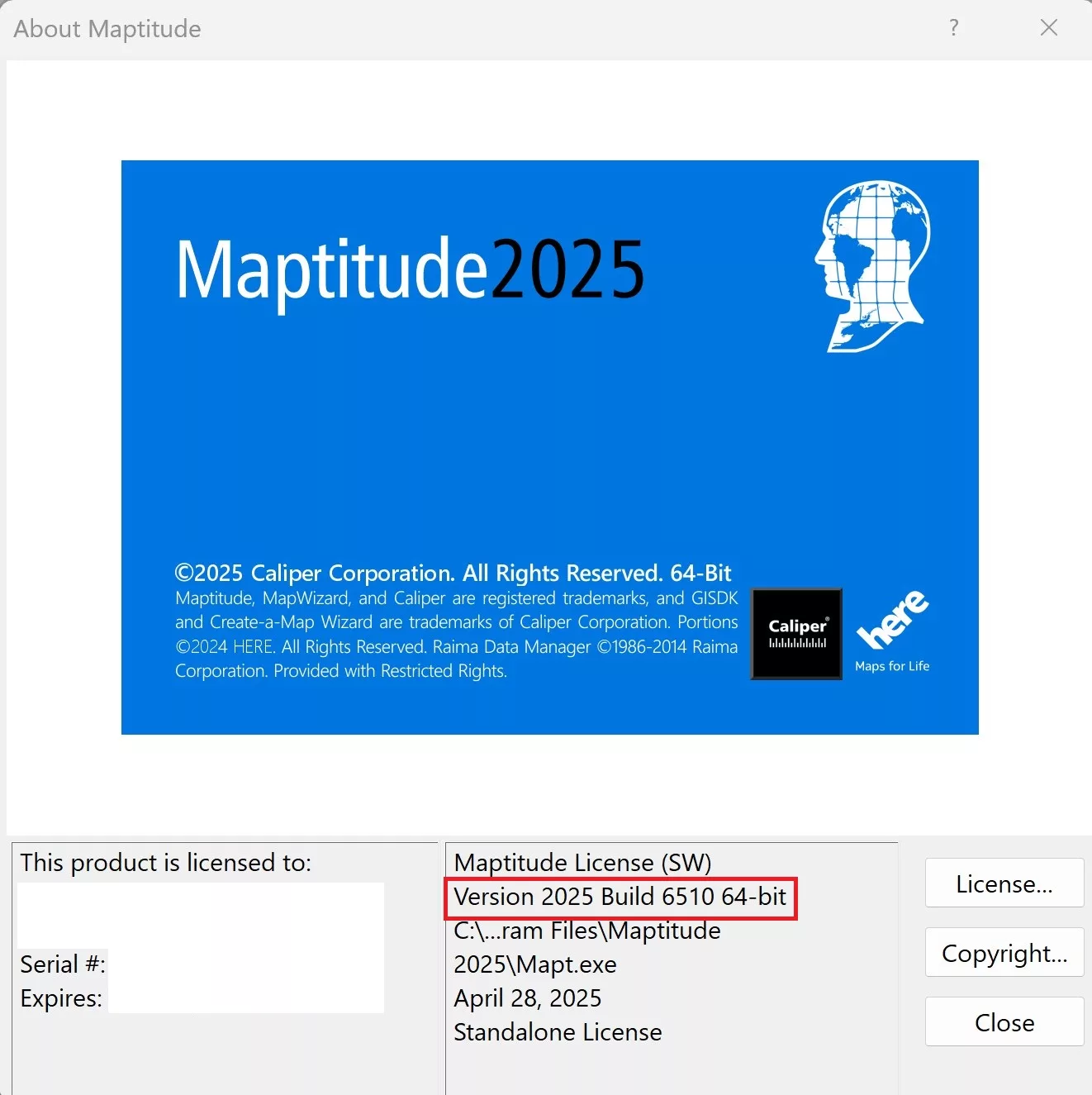 As we improve the Maptitude software, new “builds” of the software are released with incremental improvements. You can see which build of the software you are using by going to Help>About… from the main toolbar.