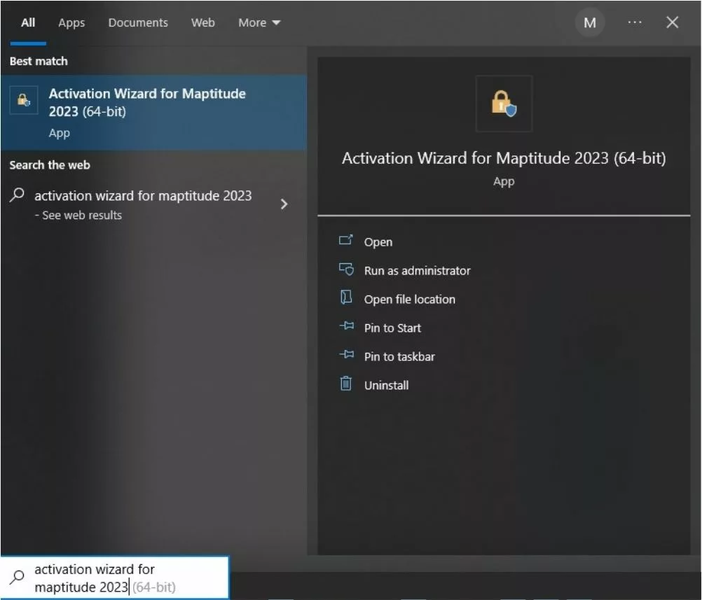 - On the machine where the license is currently activated, find and run the “Activation Wizard for Maptitude” under the Windows Start menu