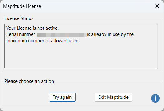 This should result in the Wizard obtaining and applying a new “activation code” (not the same as your “serial number”) from the Maptitude license server.