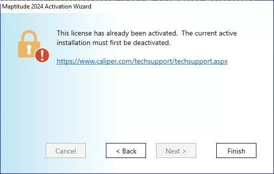 This article describes how to transfer/move a license of Maptitude from one location to another. A license of Maptitude, either Single User or Remote Desktop, can only be activated in one location at a time. If you try to activate it, when it is already activated elsewhere, you will see the following error message: “Your License is not active. Serial number xxx-xxx-xxx-xxx is already in use by the maximum number of allowed users.” or “Your request was not validated by the server. This license has already been activated. The current active installation must first be deactivated. Please contact Caliper:”