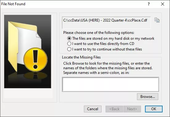 For example, the message may show that Maptitude cannot locate one of the country package files: C:\ccData\USA (HERE) – 20XX Quarter 4\ccPlace.Cdf.