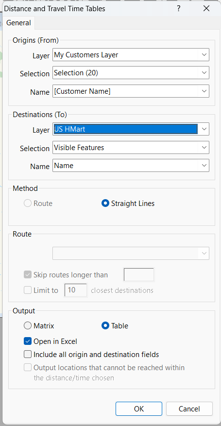 Once the layer has been added and checked to be visible, you should see the Route radio button under the Distance and Travel Time Table menu.