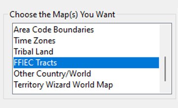 The Census Tracts included with the Maptitude U.S. Country Package (FREE with a Maptitude purchase) contain over 1000 fields of Federal Financial Institutions Examination Council (FFIEC) data (PDF). These data help financial institutions protect consumers and communities but also provide valuable data for use in all industries.