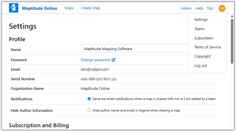 Administrative users can choose Settings from the Options and Settings Menu (located at the top right-hand corner of the screen in a drop-down under your user name icon) to see and change account details, see subscription and usage limits details, and transfer maps.