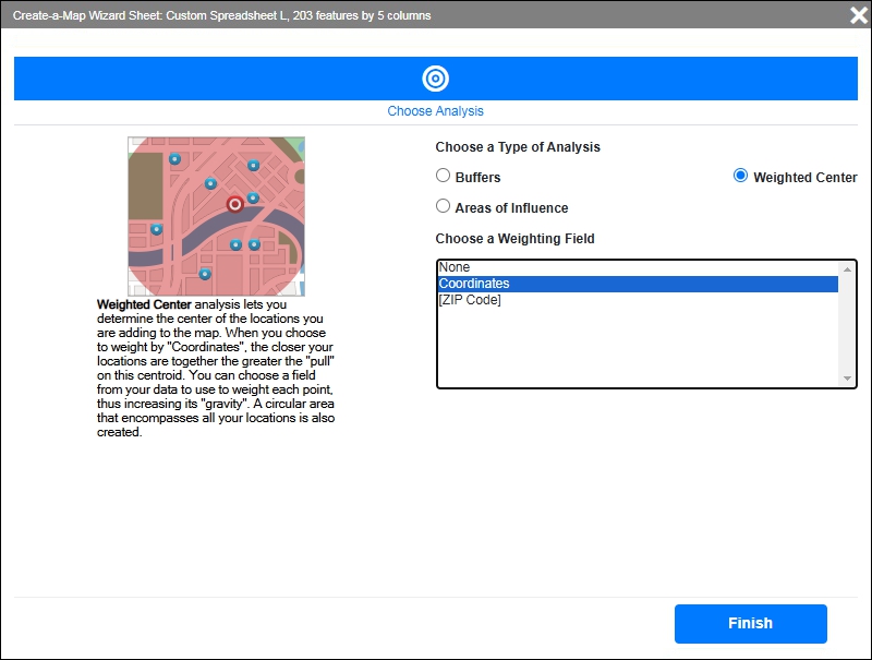 Weighted center determines from a set of points, such as customers, a circular service area that encompasses all of the points and its center. Optionally, the center can be placed at the average of the coordinates or weighted by any field in your point layer.