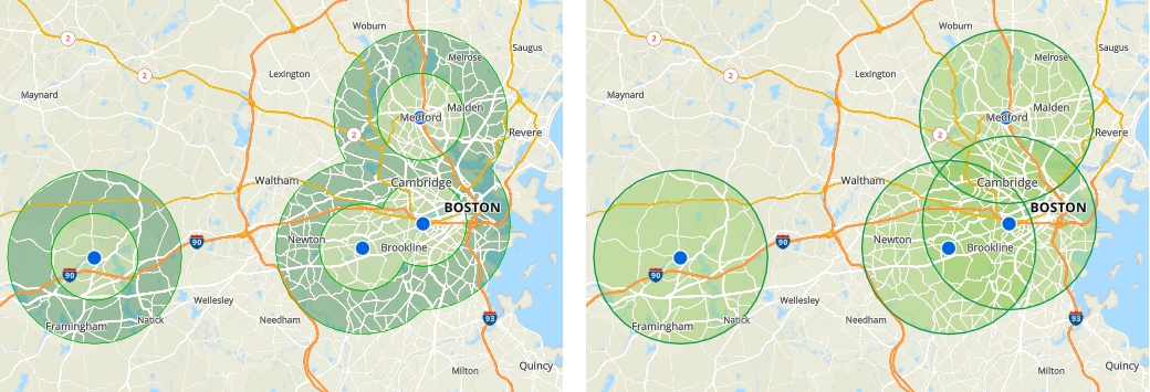 These maps show the locations of four stores. The merged buffers on the left allow you to compare the population that lives close to a store (0-2 miles) to the population that lives farther away (2-4 miles). The separate buffers on the right allow you to compare the populations around each individual store.