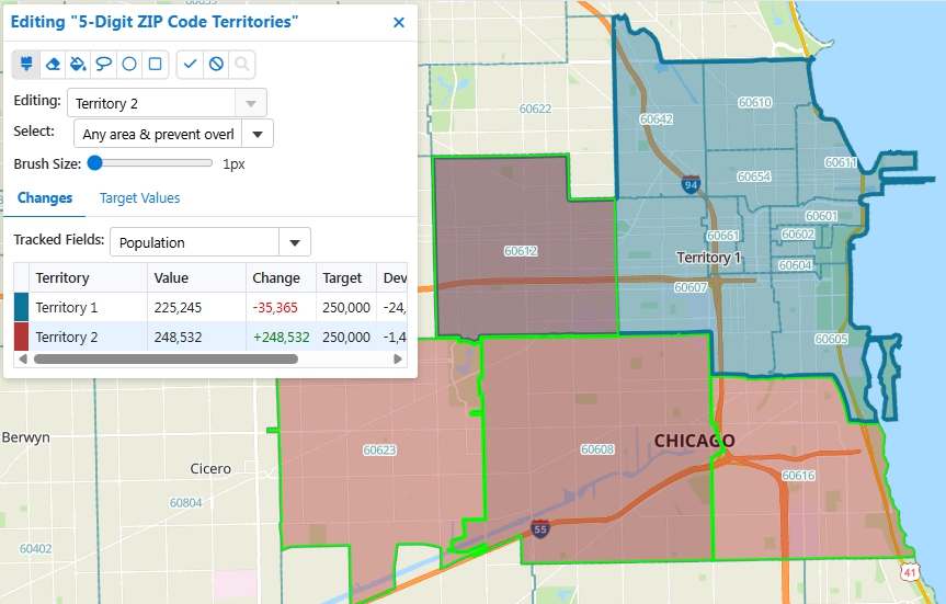 If you choose the Any Area & Prevent Overlapping Territories option, the Changes tab will show changes to any territory affected by the features that you highlight. For example, by creating a second territory from the ZIP Codes shaded in red below, including moving ZIP Code 60612 to this territory from Territory 1, the Changes tab shows you that Territory 1 population will decrease by 35,365: