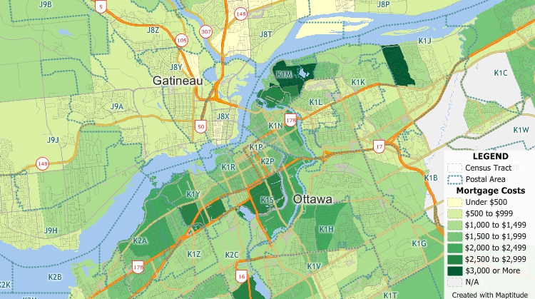 Maptitude includes demographic data useful for banking. This map shows a colour theme of median monthly mortgage costs that can be used to identify markets for refinance offers.